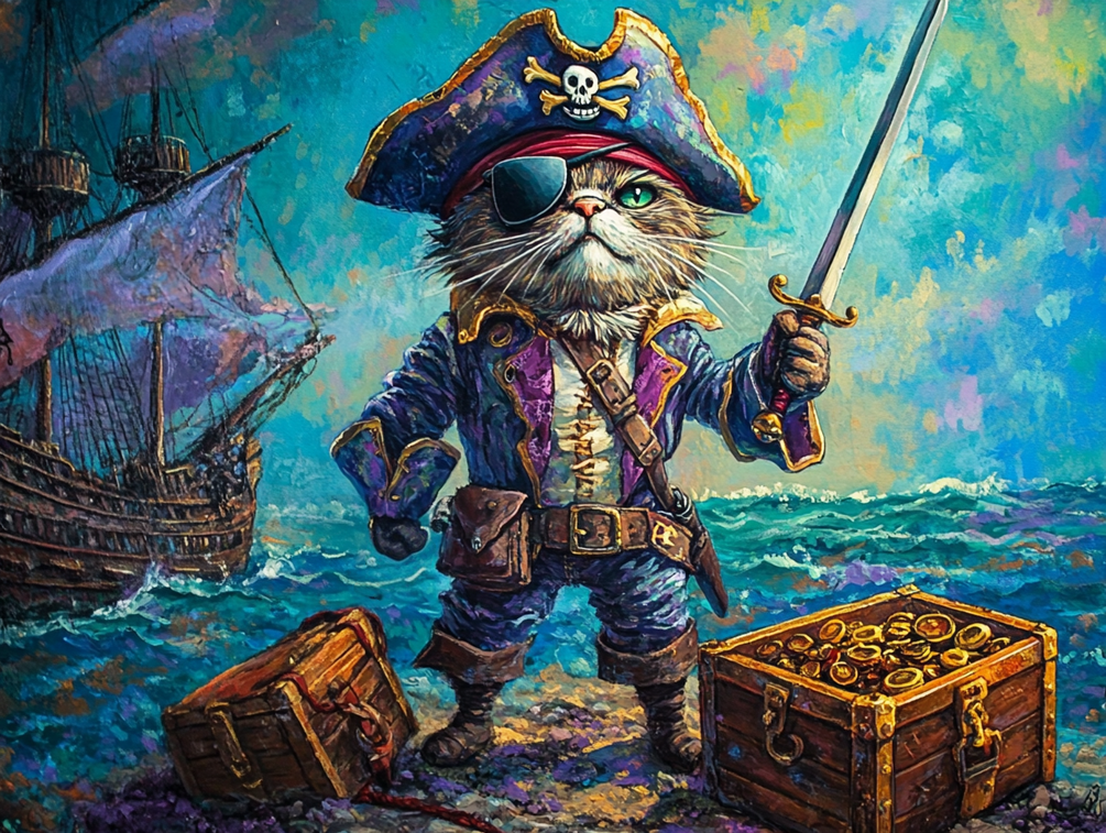 The pirate cat must choose between guarding his gold at home or going back out on his ship to hunt for more treasure.